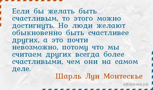 Шарль Луи МонтескьеЕсли бы желать быть счастливым, то этого можно достигнуть. Но люди желают обыкновенно быть счастливее других, а это почти невозможно, потому что мы считаем других всегда более счастливыми, чем они на самом деле.