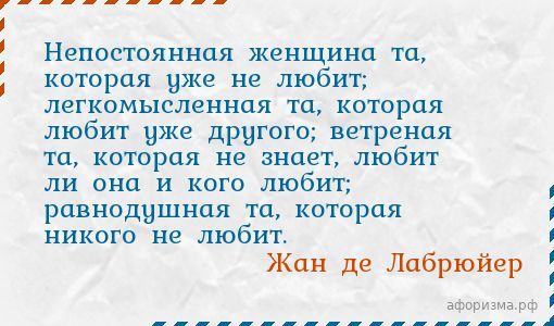 Жан де ЛабрюйерНепостоянная женщина та, которая уже не любит; легкомысленная та, которая любит уже другого; ветреная та, которая не знает, любит ли она и кого любит; равнодушная та, которая никого не любит.