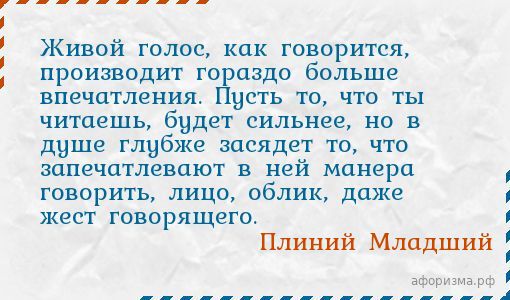 Плиний МладшийЖивой голос, как говорится, производит гораздо больше впечатления. Пусть то, что ты читаешь, будет сильнее, но в душе глубже засядет то, что запечатлевают в ней манера говорить, лицо, облик, даже жест говорящего.