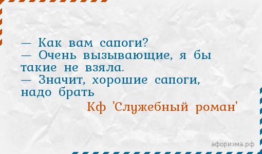 — Как вам сапоги? — Очень вызывающие, я бы такие не взяла. — Значит, хорошие сапоги, надо брать
