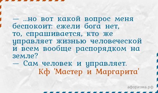 Кф 'Мастер и Маргарита'— …но вот какой вопрос меня беспокоит: ежели бога нет, то, спрашивается, кто же управляет жизнью человеческой и всем вообще распорядком на земле? — Сам человек и управляет.