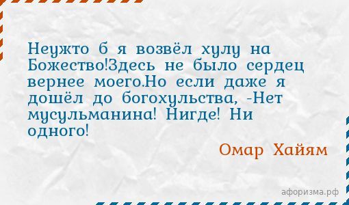 Омар ХайямНеужто б я возвёл хулу на Божество!Здесь не было сердец вернее моего.Но если даже я дошёл до богохульства, -Нет мусульманина! Нигде! Ни одного!