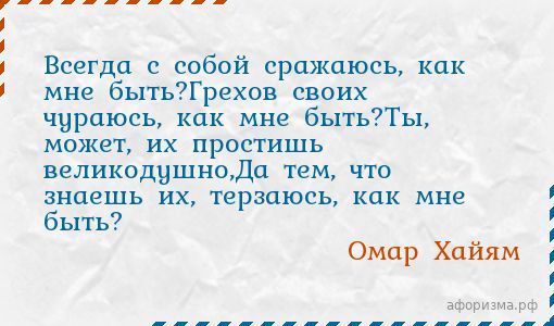 Омар ХайямВсегда с собой сражаюсь, как мне быть?Грехов своих чураюсь, как мне быть?Ты, может, их простишь великодушно,Да тем, что знаешь их, терзаюсь, как мне быть?