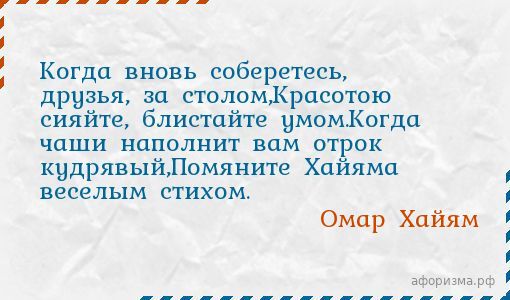 Омар ХайямКогда вновь соберетесь, друзья, за столом,Красотою сияйте, блистайте умом.Когда чаши наполнит вам отрок кудрявый,Помяните Хайяма веселым стихом.