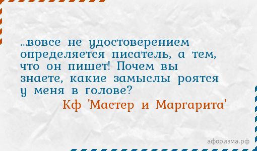 Кф 'Мастер и Маргарита'…вовсе не удостоверением определяется писатель, а тем, что он пишет! Почем вы знаете, какие замыслы роятся у меня в голове?