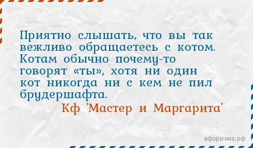Кф 'Мастер и Маргарита'Приятно слышать, что вы так вежливо обращаетесь с котом. Котам обычно почему-то говорят «ты», хотя ни один кот никогда ни с кем не пил брудершафта.