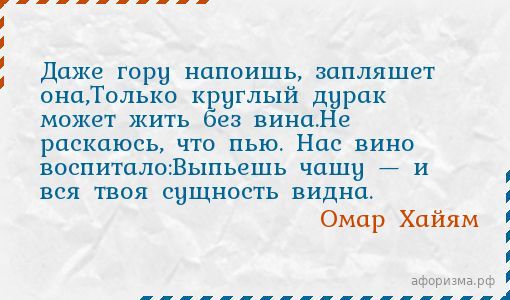 Омар ХайямДаже гору напоишь, запляшет она,Только круглый дурак может жить без вина.Не раскаюсь, что пью. Нас вино воспитало:Выпьешь чашу — и вся твоя сущность видна.