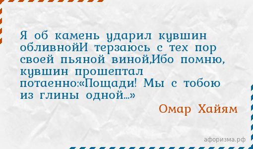 Омар ХайямЯ об камень ударил кувшин обливнойИ терзаюсь с тех пор своей пьяной виной,Ибо помню, кувшин прошептал потаенно:«Пощади! Мы с тобою из глины одной...»