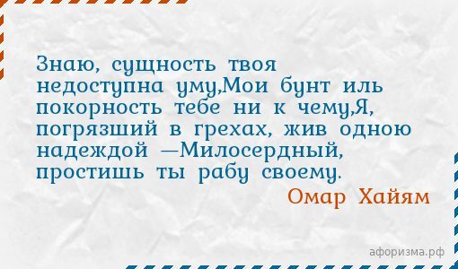 Омар ХайямЗнаю, сущность твоя недоступна уму,Мои бунт иль покорность тебе ни к чему,Я, погрязший в грехах, жив одною надеждой —Милосердный, простишь ты рабу своему.