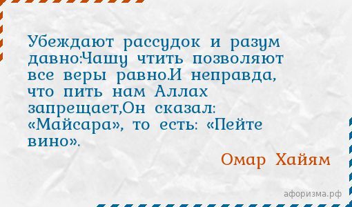 Омар ХайямУбеждают рассудок и разум давно:Чашу чтить позволяют все веры равно.И неправда, что пить нам Аллах запрещает,Он сказал: «Майсара», то есть: «Пейте вино».