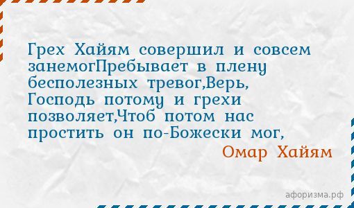 Омар ХайямГрех Хайям совершил и совсем занемогПребывает в плену бесполезных тревог,Верь, Господь потому и грехи позволяет,Чтоб потом нас простить он по-Божески мог,