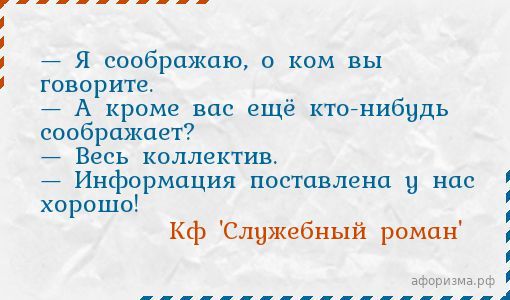 Кф 'Служебный роман'— Я соображаю, о ком вы говорите. — А кроме вас ещё кто-нибудь соображает? — Весь коллектив. — Информация поставлена у нас хорошо!
