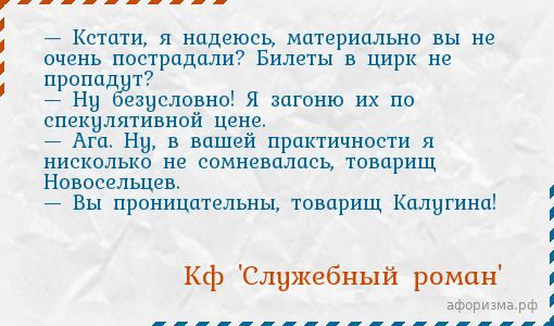 — Кстати, я надеюсь, материально вы не очень пострадали? Билеты в цирк не пропадут? — Ну безусловно! Я загоню их по спекулятивной цене. — Ага. Ну, в вашей практичности я нисколько не сомневалась, товарищ Новосельцев. — Вы проницательны, товарищ Калугина!