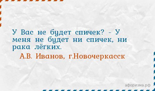 У Вас не будет спичек? - У меня не будет ни спичек, ни рака лёгких.