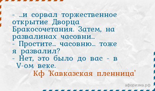 Кф 'Кавказская пленница'- ...и сорвал торжественное открытие Дворца Бракосочетания. Затем, на развалинах часовни... - Простите... часовню... тоже я развалил? - Нет, это было до вас - в XIV-ом веке.