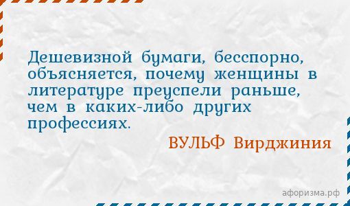 ВУЛЬФ ВирджинияДешевизной бумаги, бесспорно, объясняется, почему женщины в литературе преуспели раньше, чем в каких-либо других профессиях.