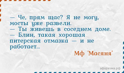 — Че, прям щас? Я не могу, мосты уже развели. — Ты живешь в соседнем доме. — Блин, такая хорошая питерская отмазка — и не работает…