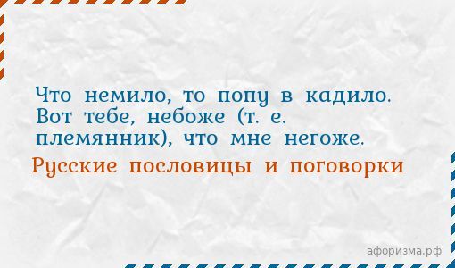 Что немило, то попу в кадило. Вот тебе, небоже (т. е. племянник), что мне негоже.