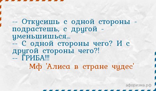 Мф 'Алиса в стране чудес'-- Откусишь с одной стороны - подрастешь, с другой - уменьшишься... -- С одной стороны чего? И с другой стороны чего?! -- ГРИБА!!!