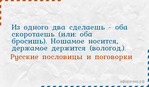 Русские пословицы и поговоркиИз одного два сделаешь - оба скоротаешь (или: оба бросишь). Ношамое носится, держамое держится (вологод.).