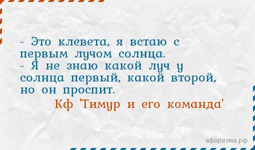 Кф 'Тимур и его команда'- Это клевета, я встаю с первым лучом солнца. - Я не знаю какой луч у солнца первый, какой второй, но он проспит.